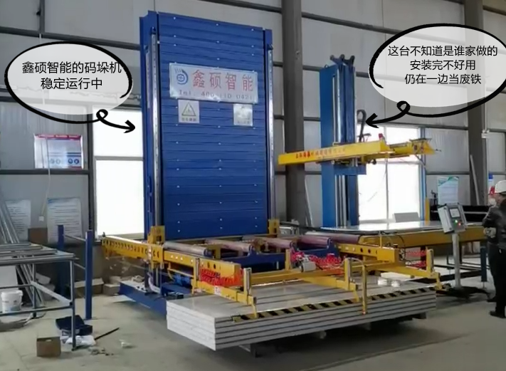 今日,山西客户新定的两台彩钢夹芯板码垛机顺利安装调试并投入生产使用。此前该客户于其他夹芯板码垛机厂家定制一台码垛机设备,安装之后始终问题不断导致客户无法正常使用,无奈之下只能仍在一边。然后于辽宁(中国)有限公司机械,定制3台彩钢夹芯板码垛机器人。安装调试之后,一直稳定运行使用中。客户给予(中国)有限公司高度认可。